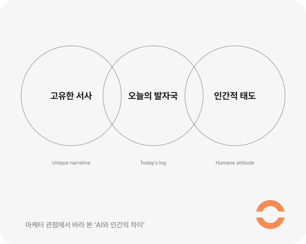AI를 안쓰고 모든 걸 다 사람이 하면 차별화가 될까요? 요즘 세상에 출혈이 너무 큽니다. 속도도 좀 느린게 아니고요. AI는 분명 유용한 도구입니다. 잘 쓰면 효율을 크게 높일 수 있습니다. 문제는 AI를 쓰느냐 마느냐가 아닙니다. AI가 ‘대체할 수 없는 영역’을 얼마나 잘 지키고 있느냐에 달려 있죠.