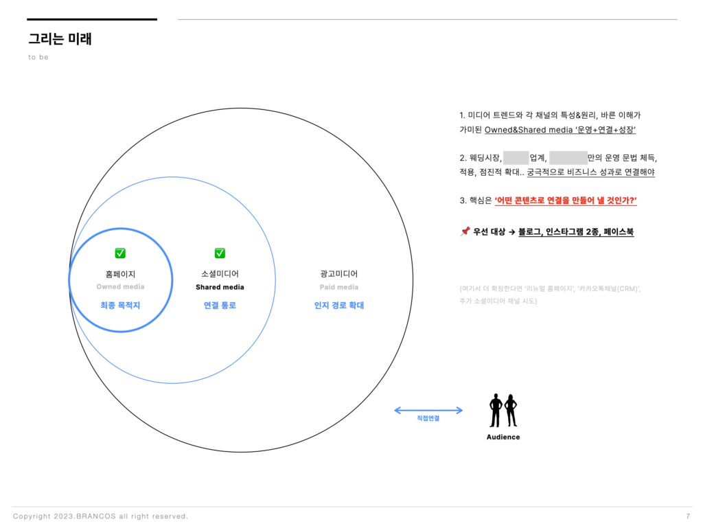 그래서 기획만 해도 2, 3주 가량의 시간이 소요됩니다. 시장조사와 경쟁사 조사, 자사 분석과 고객 분석. 이 과정을 거쳐야 비로소 브랜드가 어떤 미디어를 가져야 하는지, 어떤 콘텐츠를 만들어야 하는지 보입니다. 우리는 브랜드 소유 미디어, 그러니까 Owned Media 중심의 전략을 지향합니다. 브랜드가 온전히 소유하고 통제할 수 있는 미디어가 바로 서야 외부 매체를 통한 광고 활동도 빛을 낼 수 있습니다.